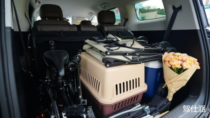 我们尝试了一下,这样的空间可轻松同时容纳大号宠物箱、全套露营装备,包括野餐篮、咖啡壶等物品,让人对用车场景充满无限遐想。