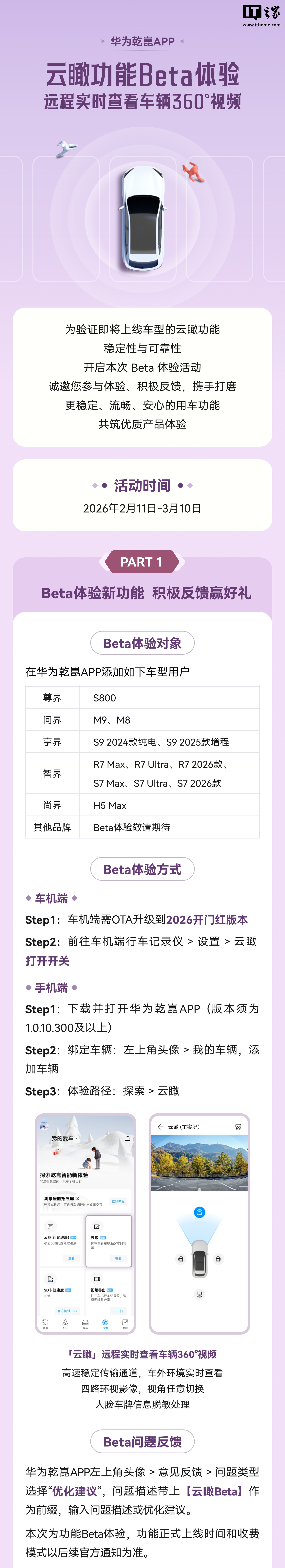 IT之家 2 月 12 日消息,华为乾崑官方产品经理昨日宣布,鸿蒙智行部分车型开启哨兵增强模式云瞰功能 Beta 体验,支持远程实时查看车辆 360° 视频等。