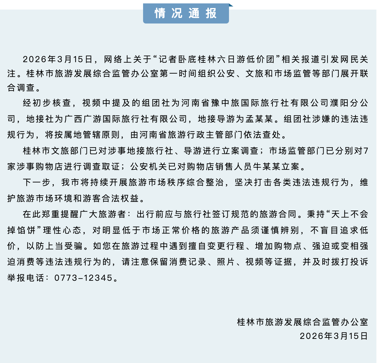 3月16日,桂林市旅游发展综合监管办公室通报:3月15日,网络上关于“记者卧底桂林六日游低价团”相关报道引发网民关注。桂林市旅游发展综合监管办公室第一时间组织公安、文旅和市场监管等部门展开联合调查。
